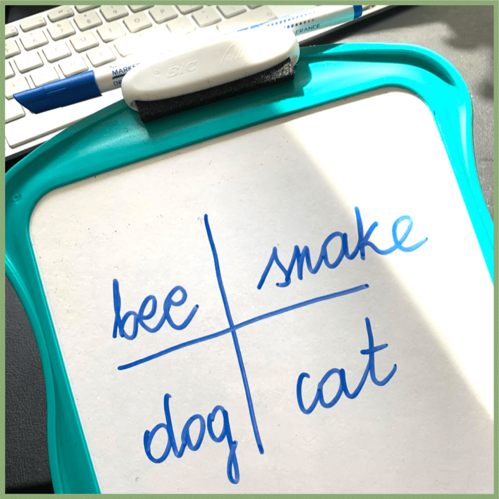 My na lekcji graliśmy w pisane Bingo. Napisaliśmy w mini tabelce nazwy czterech zwiarząt, a potem wykreślaliśmy te, które wylosowałam (wyczytałam).