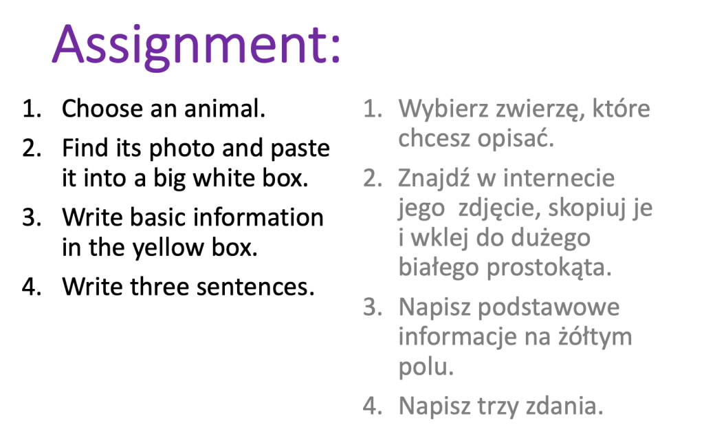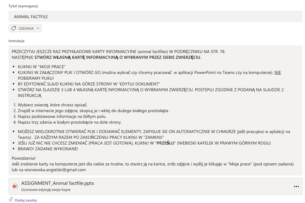 Na Teams przesłałam ci plik programu PowerPoint (Assignment_Animal factfiles.pptx), który należy otworzyć (=kliknąć w załącznik) i postępować dalej według dołączonej na Teams instrukcji.