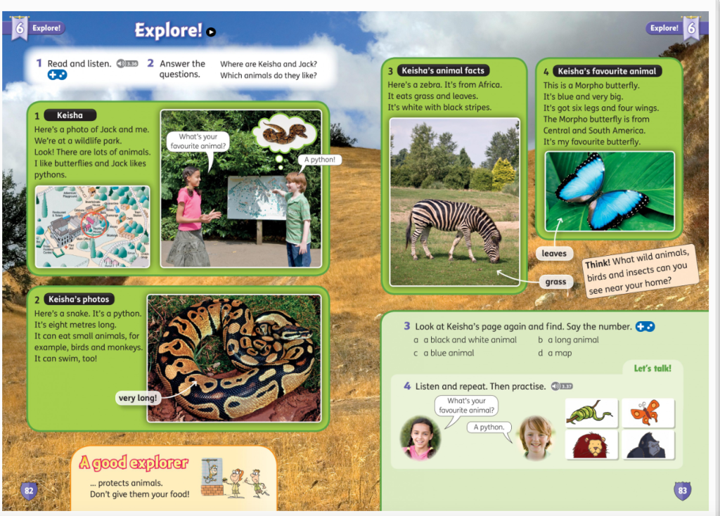 Naturalne siedliska (natural habitats) to nie jedyne miejsca, w których możemy spotkać zwierzęta. Człowiek od lat buduje specjalne miejsca – zoos and wildlife parks, w których można zobaczyć zwierzęta z całego świata. Odwiedzimy teraz wraz z Keishą i Jack’iem jedno z nich. Watch the video: Explore! A wildlife park.