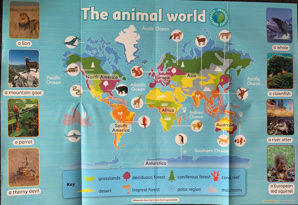 Najpierw spójrz na plakat i wymień widoczne na nim zwierzęta. What animals can you see on the Animal World Map?