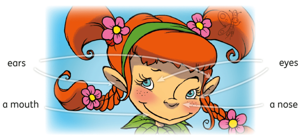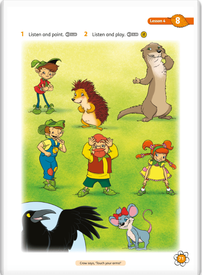 A teraz połączymy części ciała z częściami twarzy czyli naszą dzisiejszą i poprzednią lekcję. Słuchaj, patrz na obrazki na stronie 71 i wskazuj paluszkiem. Kliknij play▶️.