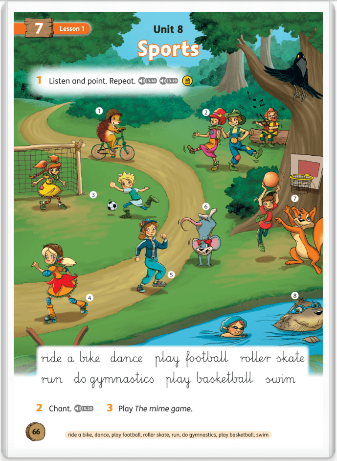Nasze podręczniki już na kwarantannie w bibliotece, więc patrz na skan strony 66, kliknij play▶️ i wskazuj paluszkiem. Zaczynamy od Hedgehog (1), kończymy na Otter (8), a potem nastąpi zmiana. en and point.