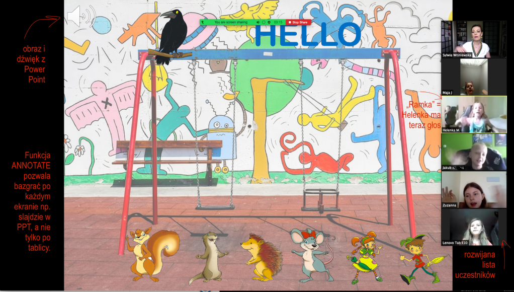PS. W ramach post scriptum opowiastka z poligonu zdalnej edukacji. Dzisiejsza lekcja była pierwotnie zaplanowana na prośbę dzieci na Teams. Już tworząc lekcję po rozmowie z koleżanką pracującą na Teams (a nie tylko widującą się z dziećmi na wideopogadankach), zrozumiałam, że prawdopodobnie „strzeliłam sobie w stopę”. Główny problem jest podobno taki, że wiele domowych komputerów (i łączy internetowych) nie daje rady, gdy tylko zaczynamy wymagać od nich przepływu większej liczby danych, na przykład mamy otwartą aplikację Teams, nagrywamy spotkanie, chcemy udostępnić fragment prezentacji w Power Point, po czym bezszelestnie przerzucić się na oprogramowanie podręcznika, albo puścić piosenkę na YouTube. W którymś momencie następuje krach! i okno się zamyka, albo pada dźwięk, albo wywala prowadzącego lub uczestników ze spotkania.