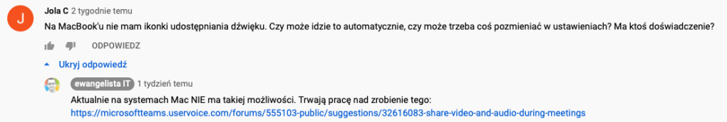 Nie mniej ja, będąc IT optymistką, jeszcze późnym wieczorem chciałam Teamsowego byka chwycić za rogi, dumając, że skoro tyle miesięcy mój blaszak dawał radę, to i teraz mnie nie zawiedzie. Był tylko jeden problem: za żadne skarby nie mogłam znaleźć ikonki „dołącz dźwięk systemowy” pozwalający dzieciom słyszeć to co udostępniam, a nie tylko dżwięk z mojego mikrofonu. Obejrzałam trzy filmy instruktażowe i nic, nie ma, nie wiem gdzie to jest. Wreszcie o godzinie 23.56 odnalazłam odpowiedź w jednym z komentarzy na YouTube: nie widzę ikonki, bo jej tam nie ma. „Trwają prace nad zrobieniem tego”. Ha, ha. 🤣 Boki zrywać.