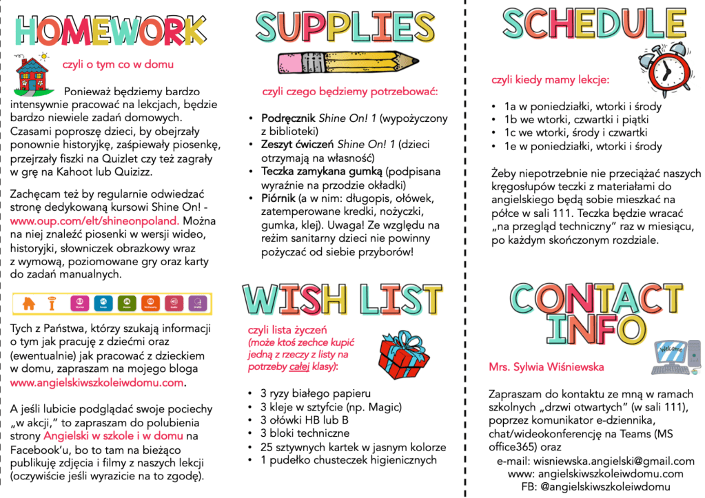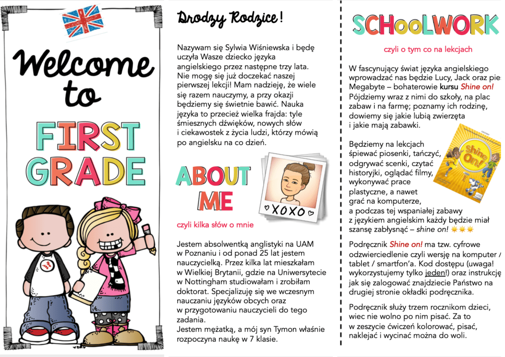 Serdecznie też witam moich osiemdziesięciu pierwszaczków. Wow! That’s quite a number! Miło was było dziś wszystkich zobaczyć. Jutro lub w czwartek spotkamy się na pierwszej lekcji i poznamy się lepiej. A gdyby któryś z rodziców zgubił moją ulotkę, to możecie ją przeczytać poniżej.