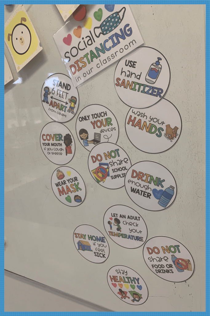 W tym dziwnym corona-roku w każdej klasie musiałam omówić zasady bezpieczeństwa, a social distancing rules (do kupienia TU) wiszą na stałe na jednej z tablic.