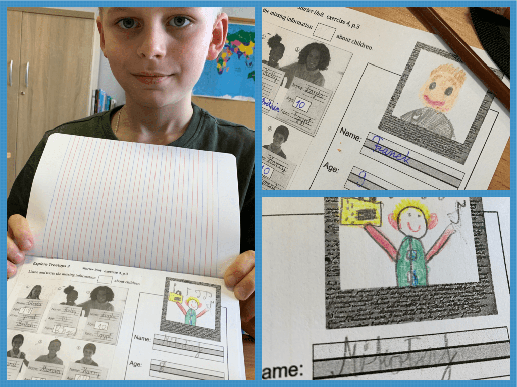 Po półrocznym niewidzeniu się z trzecimi klasami spowodowanym lockdown’em i wakacjami w tym roku szkolnym zaczęłam z nimi pracę od powtórki najważniejszych rzeczy, których się uczyliśmy w poprzednich latach. Były wszystkie nasze ulubione piosenki z Super Simple Songs, Maple Leaf Learning i the Singing Walrus dzięki którym przypomnieliśmy sobie kolory, liczby, dni tygodnia, miesiące, jedzonko, hobby i zawody. A potem najlepiej jak potrafiliśmy samodzielnie uzupełniliśmy karty All about me.