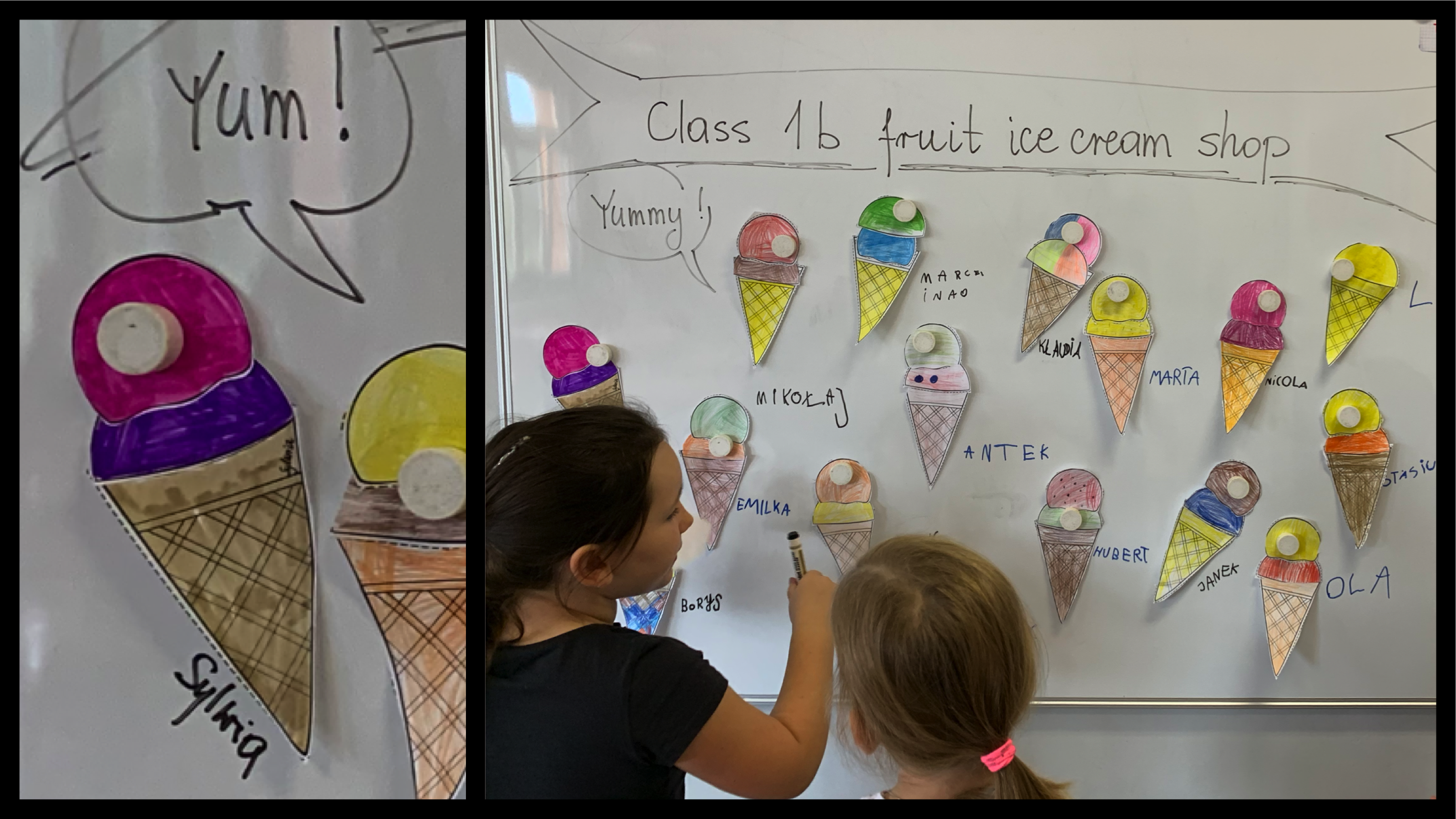 A czy potrafisz nazwać kolory lodów, które umieściłeś/łaś w rożku, który robiliśmy na lekcji? What colour is it? Ja odpowiedziałabym tak: My icecream is pink and purple. It is raspberry and blueberry icecream. A ty co odpowiesz?