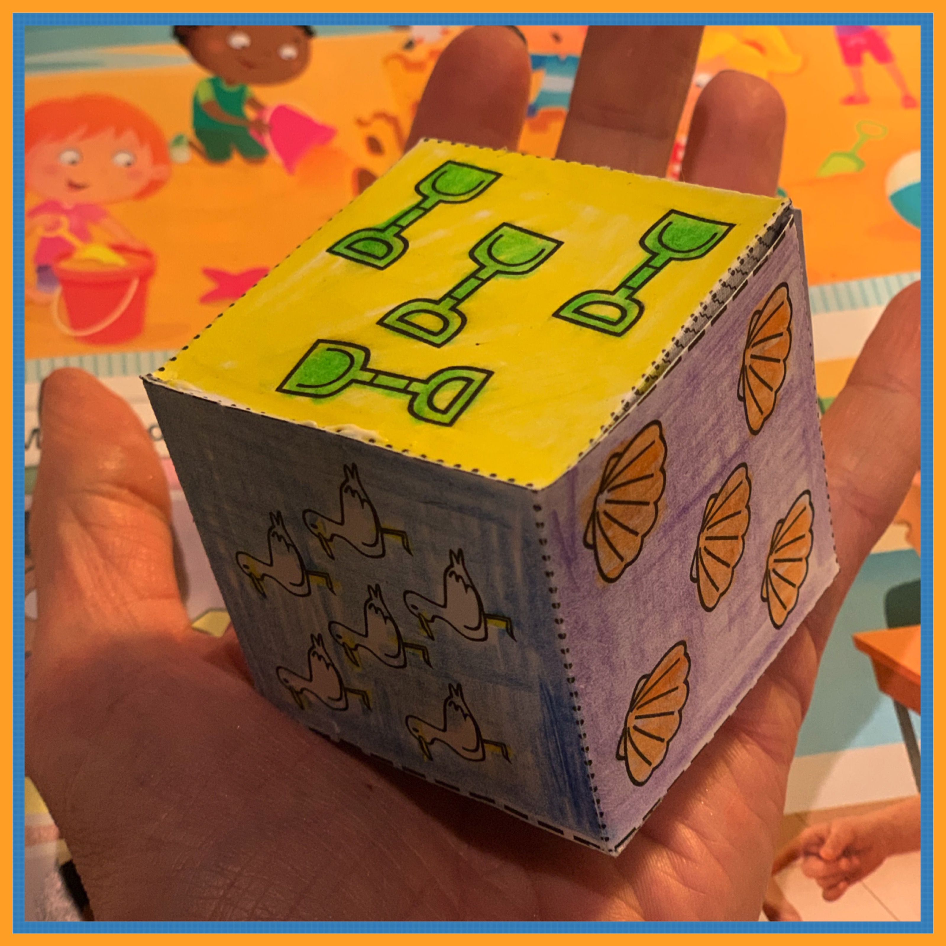 Po lekcji z piosenką Sandcastles zrobiliśmy kostkę z różnymi obrazkami. Czy potrafisz nazwać co jest na każdej ze ścianek? U mnie np. wypadło teraz Four green spades.