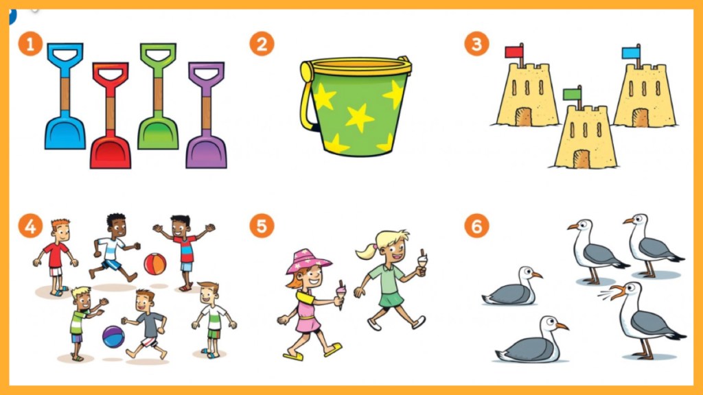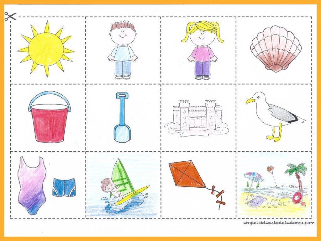 W rozdziale 4 nie tylko poznaliśmy słówka związane z zabawą na plaży, ale także utrwaliliśmy liczenie od 1 do 10 (wraz pisownią!). Wyjmij teraz z koperty wklejonej do zeszytu mini karty obrazkowe i zastanów się, czy pamiętasz wszystkie słówka związane z zabawą na plaży. Jeśli masz problemy (wiem, wiem, to już trzy tygodnie bez lekcji angielskiego!) to zajrzyj do słowniczka obrazkowego, Picture Dictionary Unit 4.