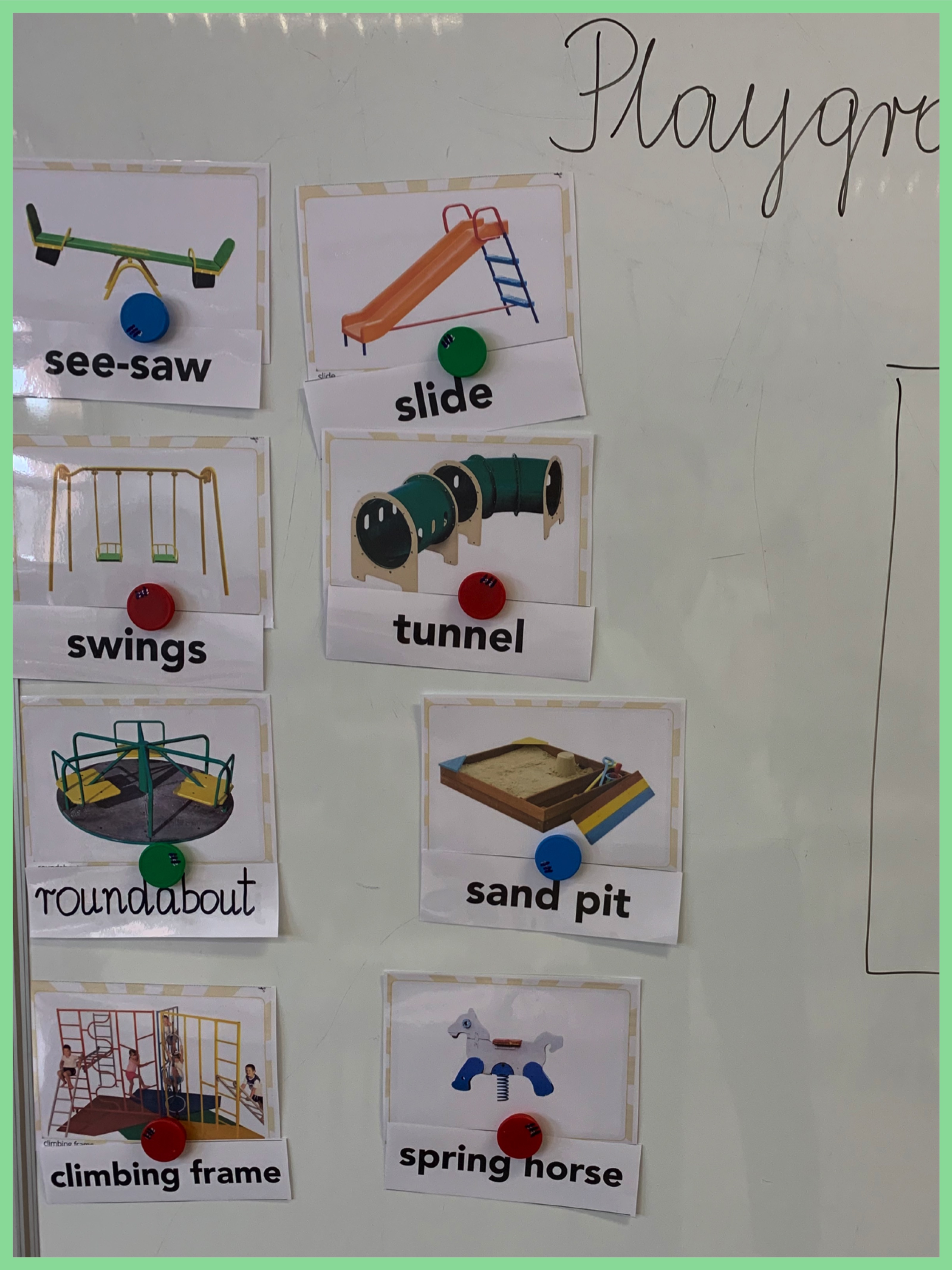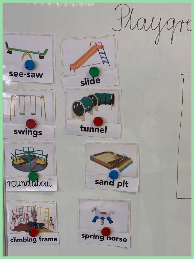 Na początek puściłam dzieciom piosenkę Playground Song i zastanowiliśmy się jakie nowe słówka będą nam potrzebne przy opisywaniu placów zabaw. Niektóre dzieci bardzo się dziwiły, że dzieci nie noszą maseczki. Hmm… Czyżby czasy bez COVID-19 były aż tak odległe?