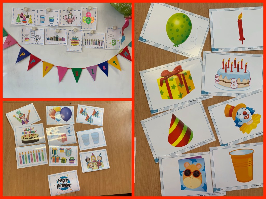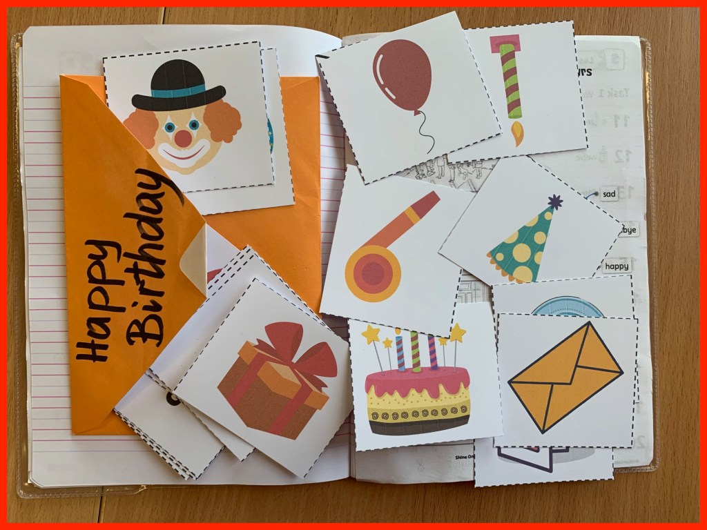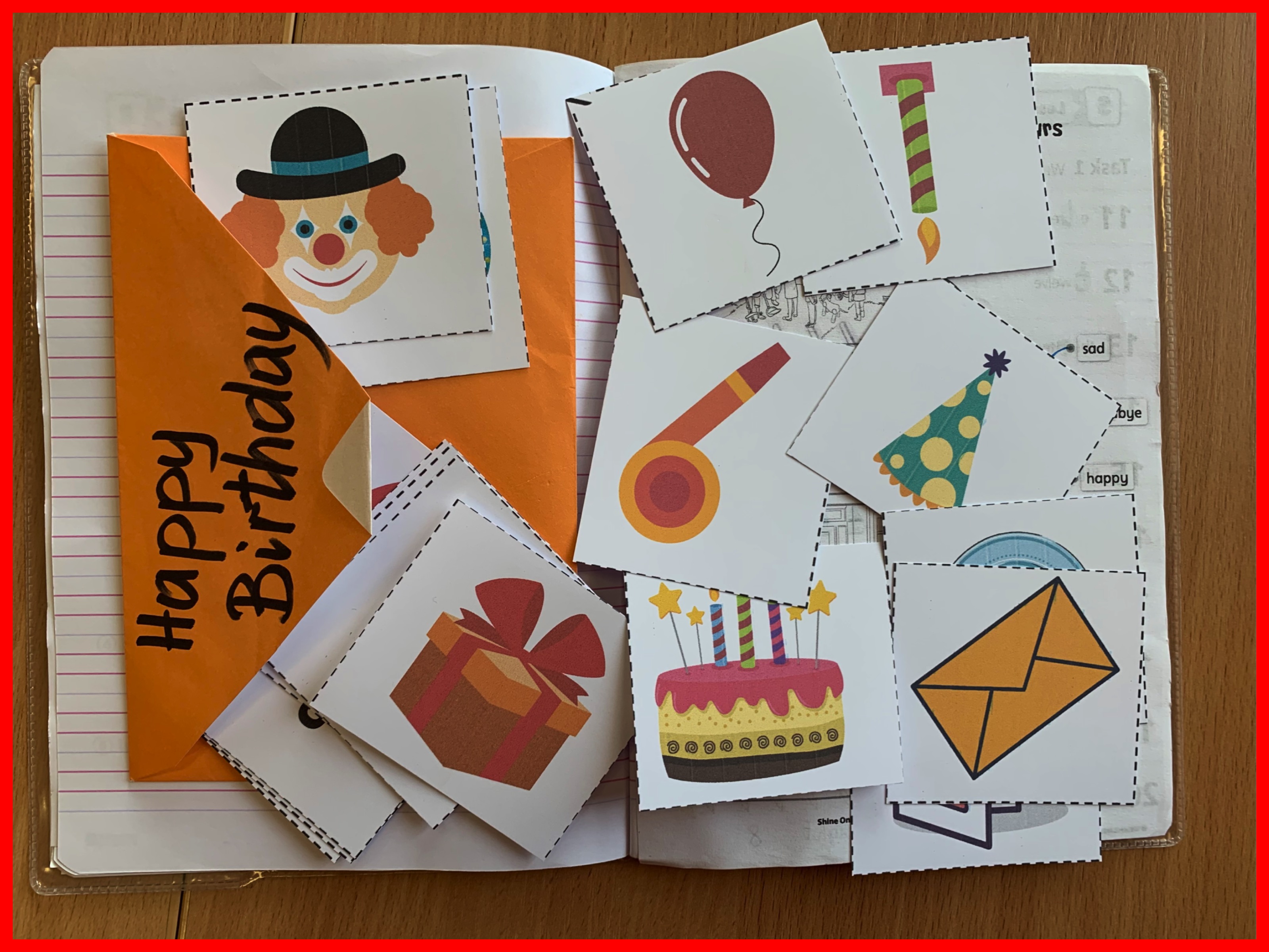 Oczywiście można też wyjąć obrazki z naszej koperty (envelope) z napisem Happy Birthday i pokazywać t,. co się na nich znajduje.