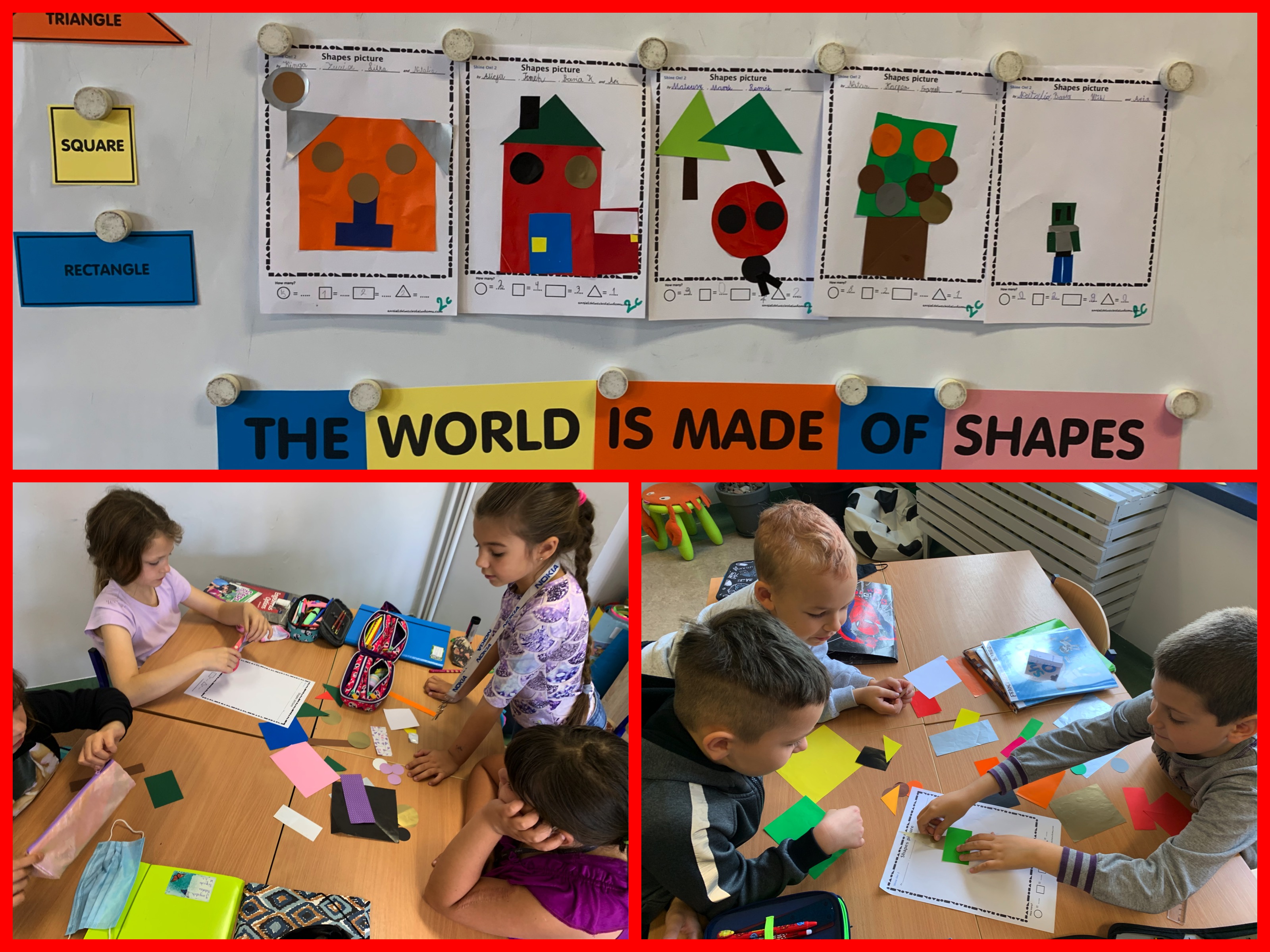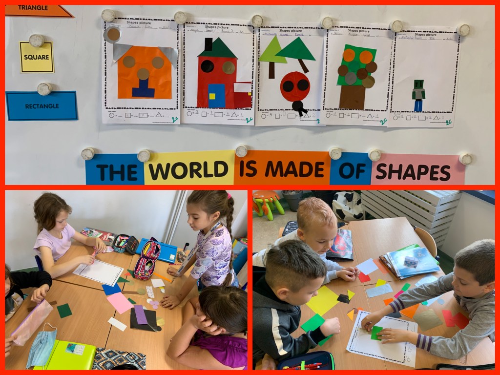 Lekcja integrująca matematykę i angielski to był naprawdę megafun. Nie dosyć, że przyjechał Mister Maker (Pan Robótka) i nauczył nas nazw figur geometrycznych (shapes) to jeszcze w grupach udało nam się stworzyć bardzo ciekawe prace z kształtów, które każdy zespół wylosował.