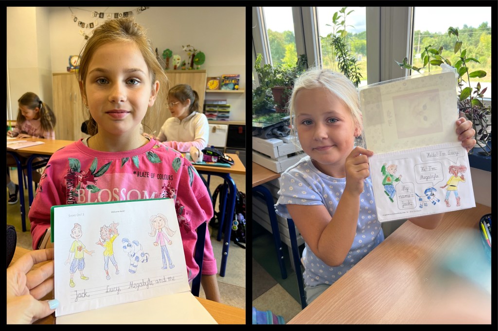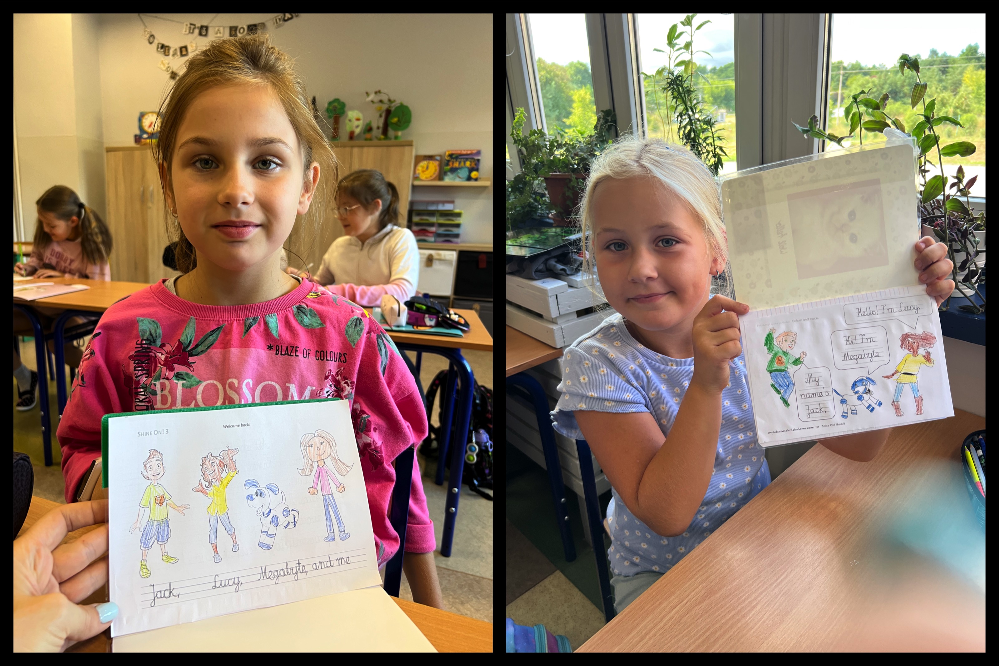 Przywitaliśmy się dobrze znaną piosenką Hello!, a potem zobaczyliśmy wideo do piosenki Shine On! – na każdym poziomie kursu się ono zmienia – nasi bohaterowie rosną, dochodzą do nich nowi przyjaciele. Jeśli chcecie to możecie teraz sprawdzić co nowego na stronie ucznia w klasie 2 i klasie 3. Znajdziecie tam słowniczek obrazkowy, gry, piosenki, historyjki i matryce do plac plastycznych.