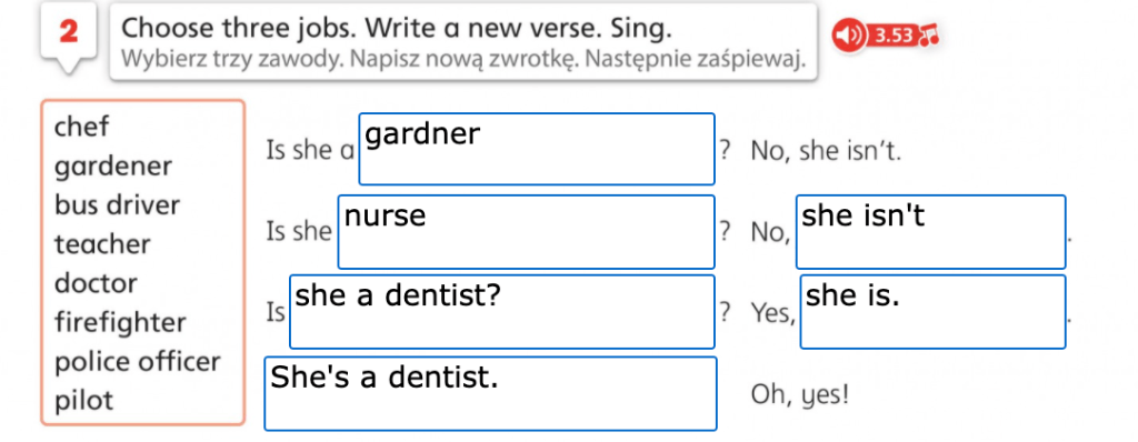 –o obrazku w górnym lewym rogu): Is she a singer? No, she isn’t. She is a doctor.