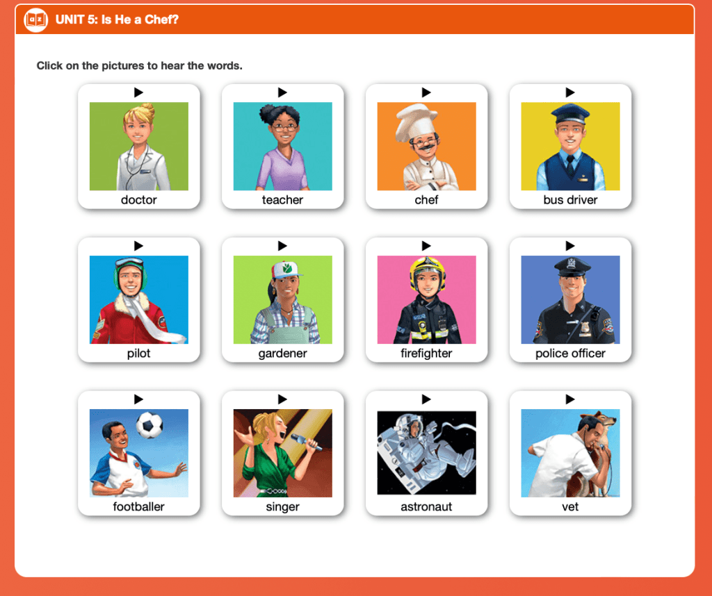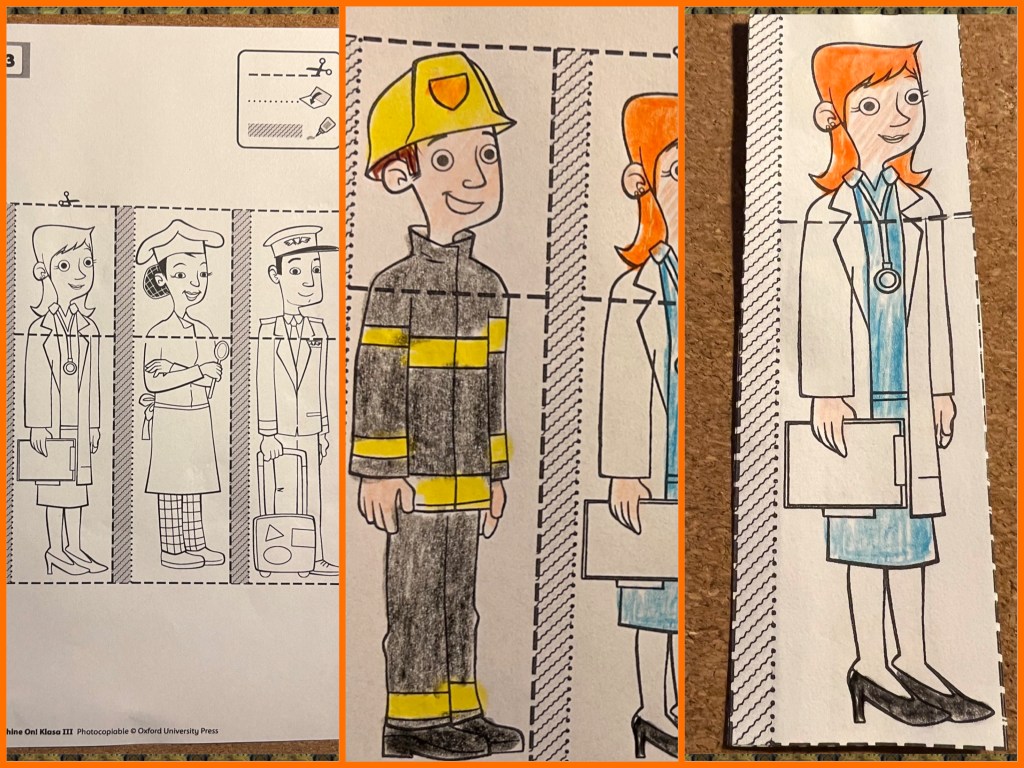 Czy po 8 lekcjach znasz już wszystkie podstawowe słówka? Wyjmij mini karteczki obrazkowe z kopertki i nazwij zawody, które na nich widzisz. A potem popatrz czy na obrazkach dany zawód wykonuje pan czy pani i układaj zdania: np. She’s a doctor. He’s a chef. Czy umiesz zadawać i odpowiadać na pytania? Na przykład,