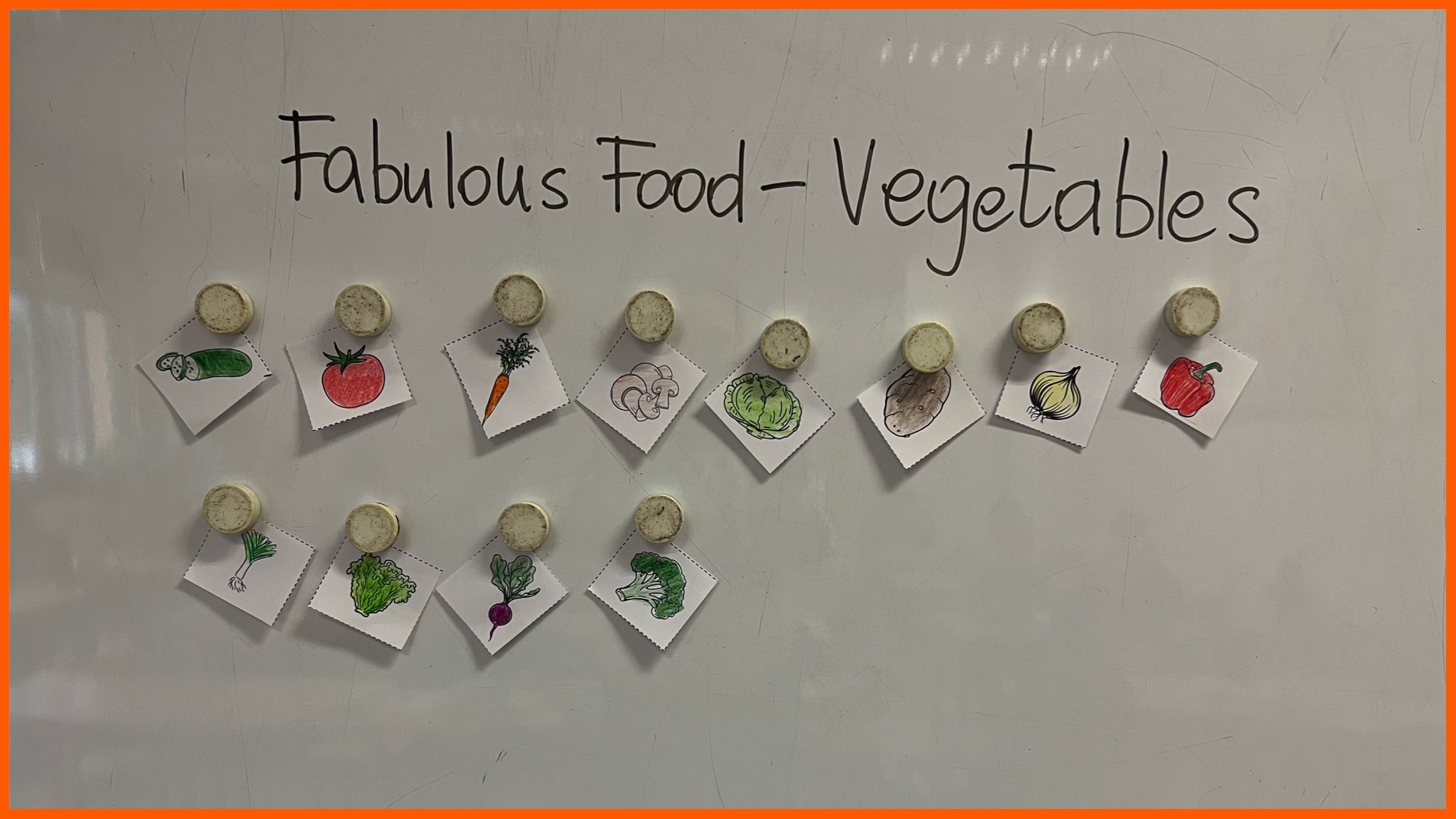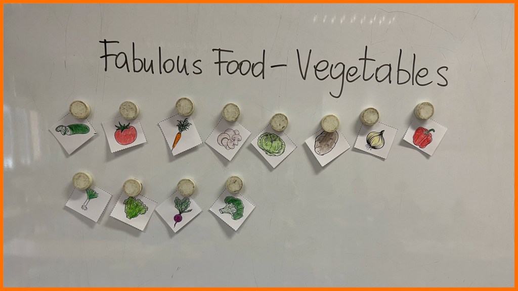 A teraz podnoś każdą karteczkę do góry i nazwij, to co na niej jest, nie tylko wyrazy podstawie, ale także dodatkowe – leek, lettuce, beetroot i broccoli.