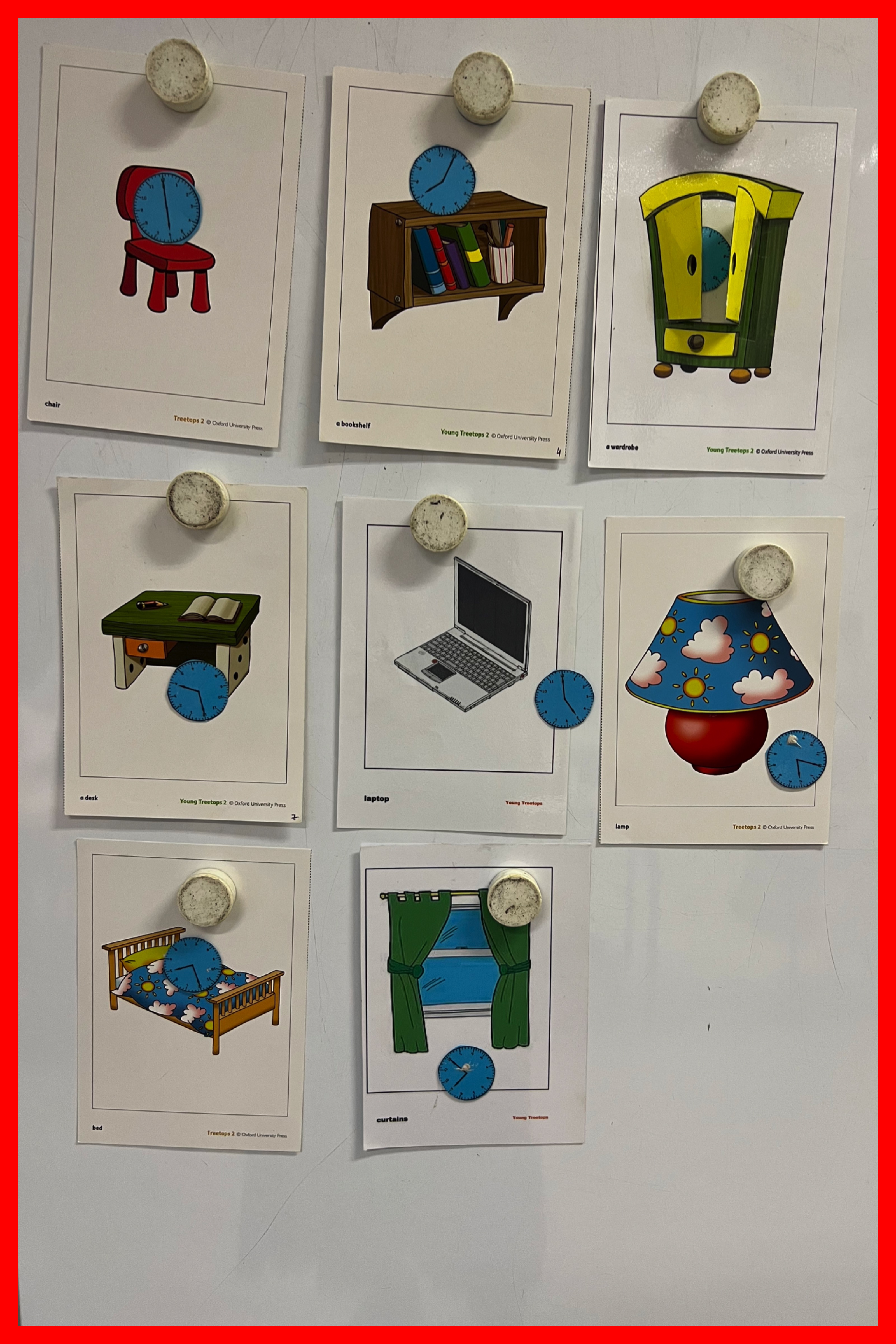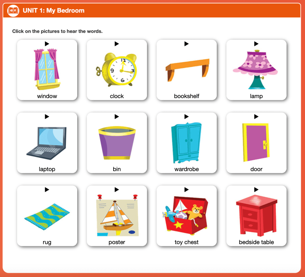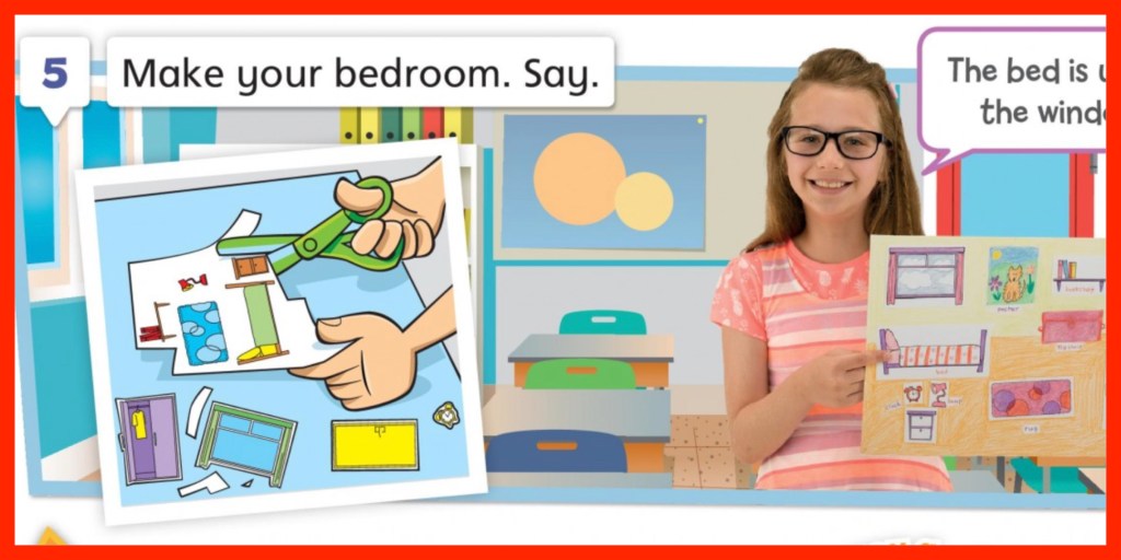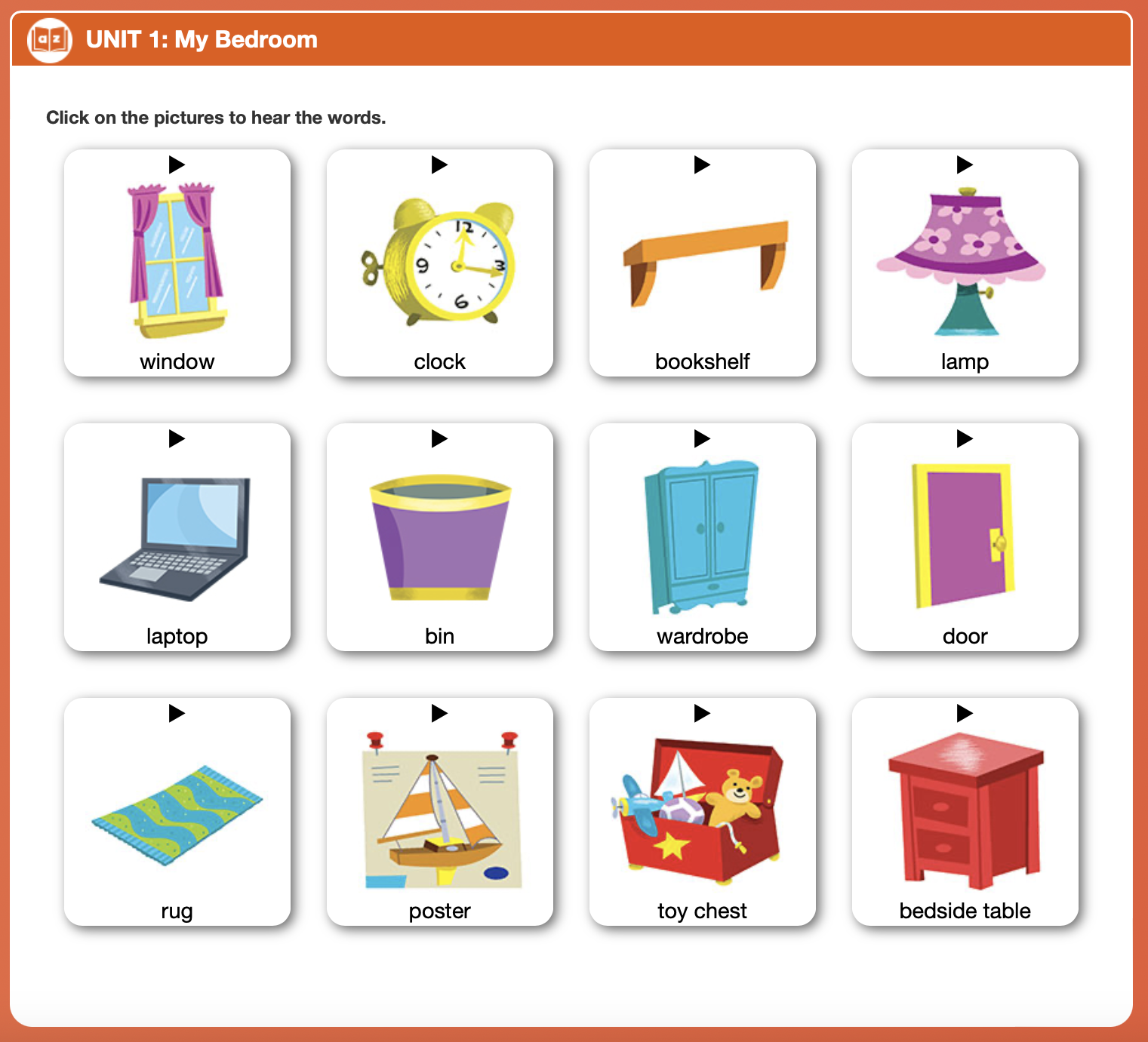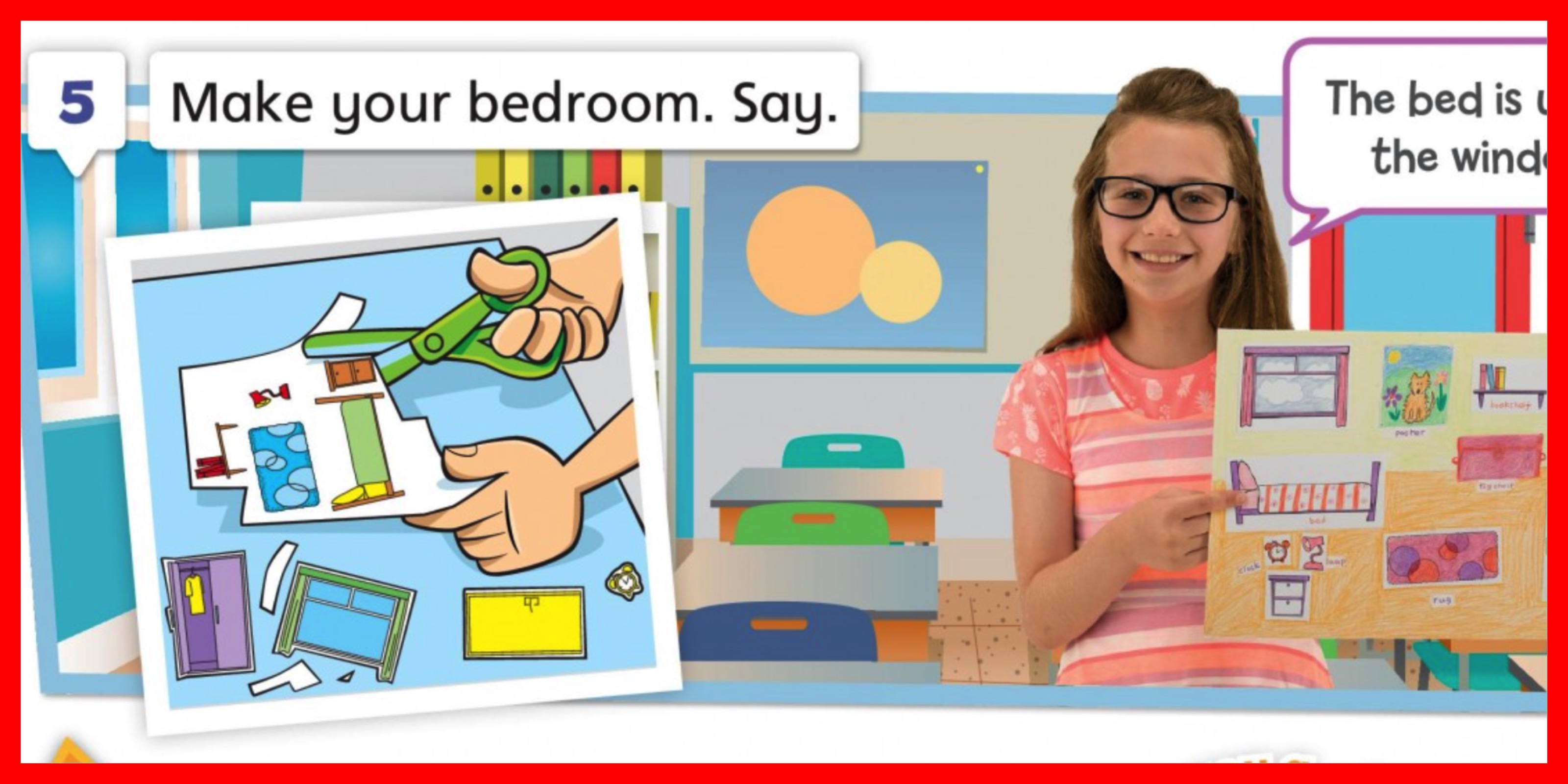 A teraz rozdział 1 – My bedroom. Wyjmij z koperty w zeszycie mini karty obrazkowe; śpiewaj rytmiczankę i pokazuj odpowiednie wyrazy. Chant and move. Kliknij ▶️ play: