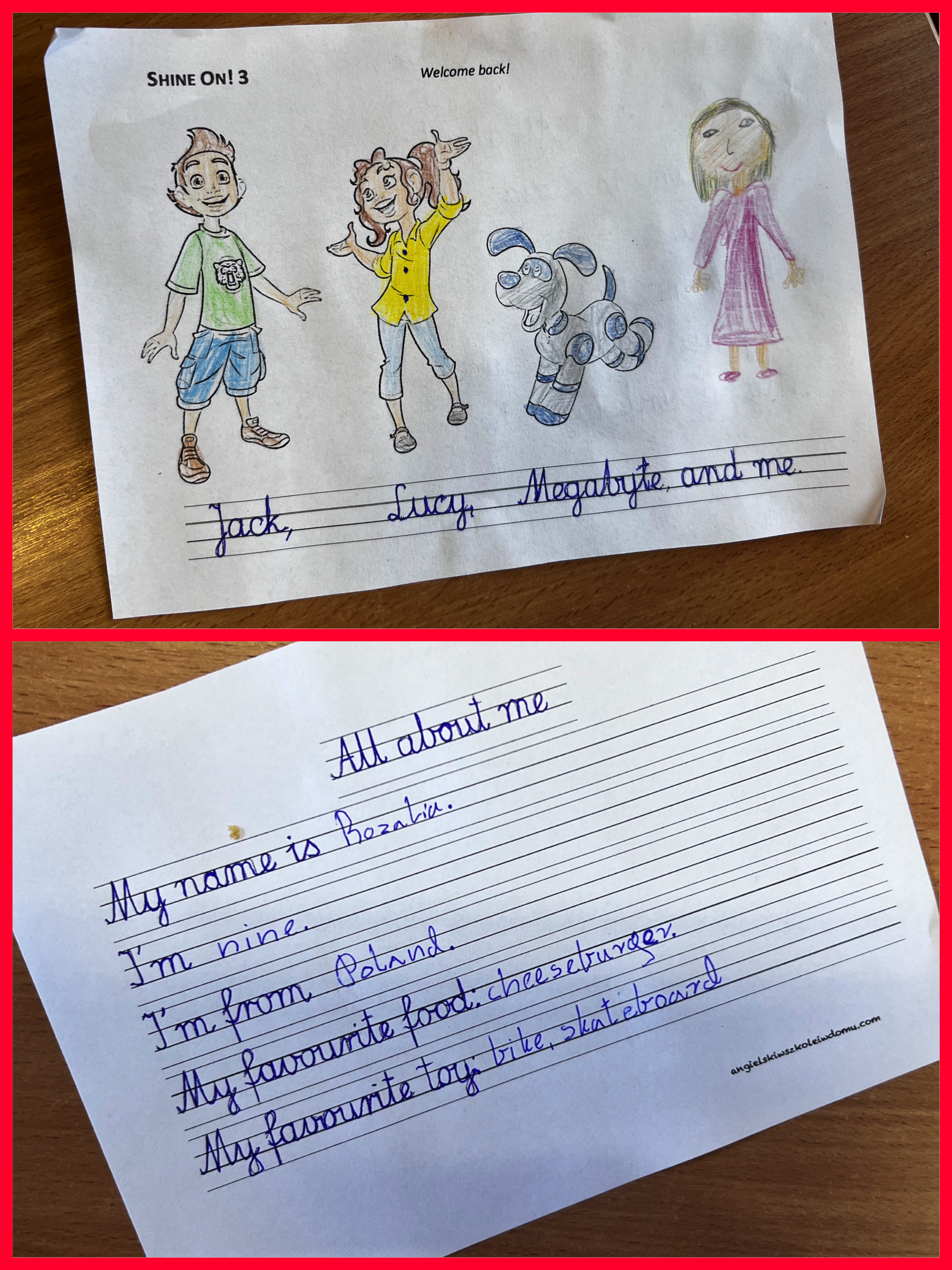 Nowy rok szkolny przywitaliśmy jak zwykle od porównania jak zmienili się znani nam od dwóch lat bohaterowie kursu Shine On! – Jack, Lucy, Uncle Alex i Megabyte. Różnice wynikają nie tylko z faktu, że każdy poziom kursu jest ilustrowany przez innego grafika, ale także dlatego, że cała trójka rośnie razem z nami oraz ponieważ pojawiają się nowi bohaterowie. W zeszłym roku była to Ellie, w tym roku Sam (story). Na wideo z piosenką powitalną widzimy też małego chłopczyka na hulajnodze (a scooter) i domyślamy się, że być może jest to brat Jack’a. Dwie lekcje póżniej z ćwiczenia na stronie 4 podręcznika dowiedzieliśmy się, że ma na imię Tom.
