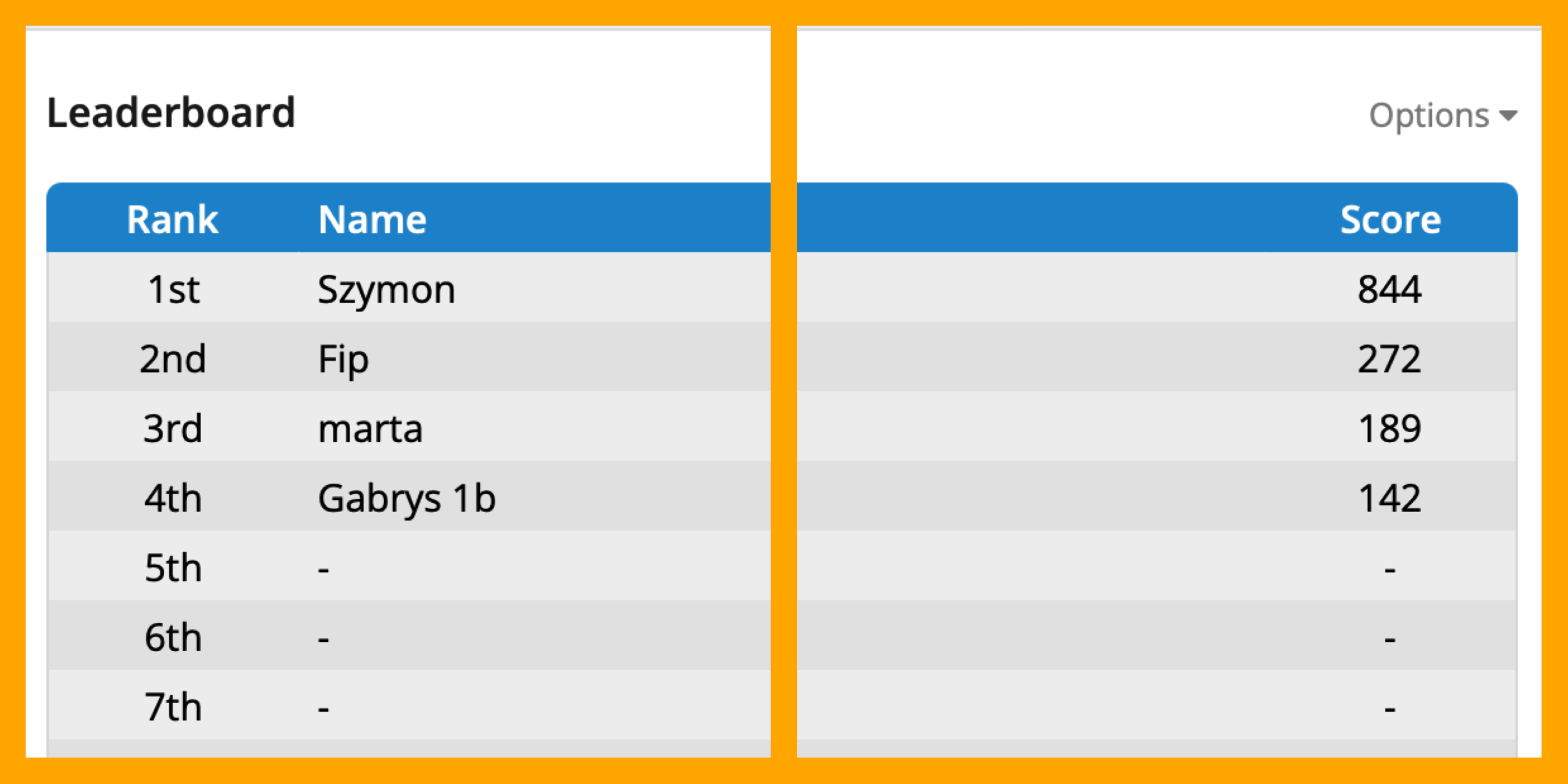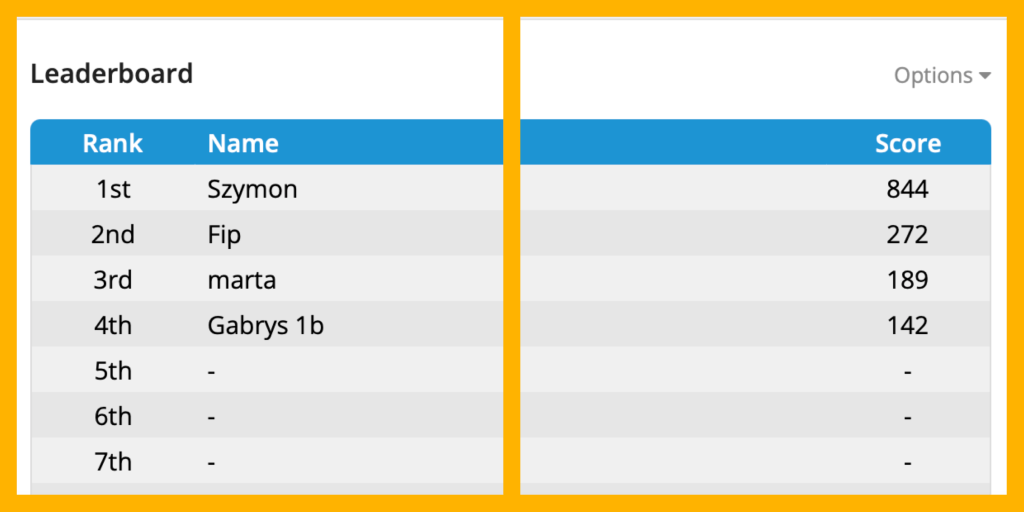Na lekcji powtórkowej graliśmy w kilka gier – jeśli chcesz możesz w nie znowu zagrać (Balloon, Planes) oraz wiele innych, które dla ciebie przygotowałam: Memory, What’s in the box, Roulette, Mini Quiz, Wordsearch (wykreślanka), Crossword (krzyżówka). Zobacz! Niektórzy już zagrali i wpisali na koniec swojej imię do Tabeli Liderów (Leaderboard):