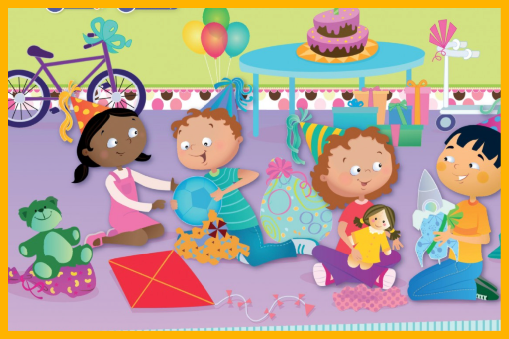 Fajna ta imprezka (a party) w tej piosence, bo prezent dostają wszyscy (There’s a present for everyone!), nie tylko solenizant. Szybko więc zakasaliśmy rękawy i zrobiliśmy pokolorowaliśmy zabawkę i pięknie ją zapakowaliśmy.