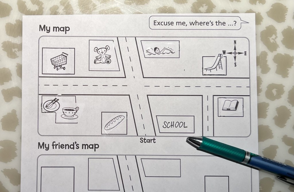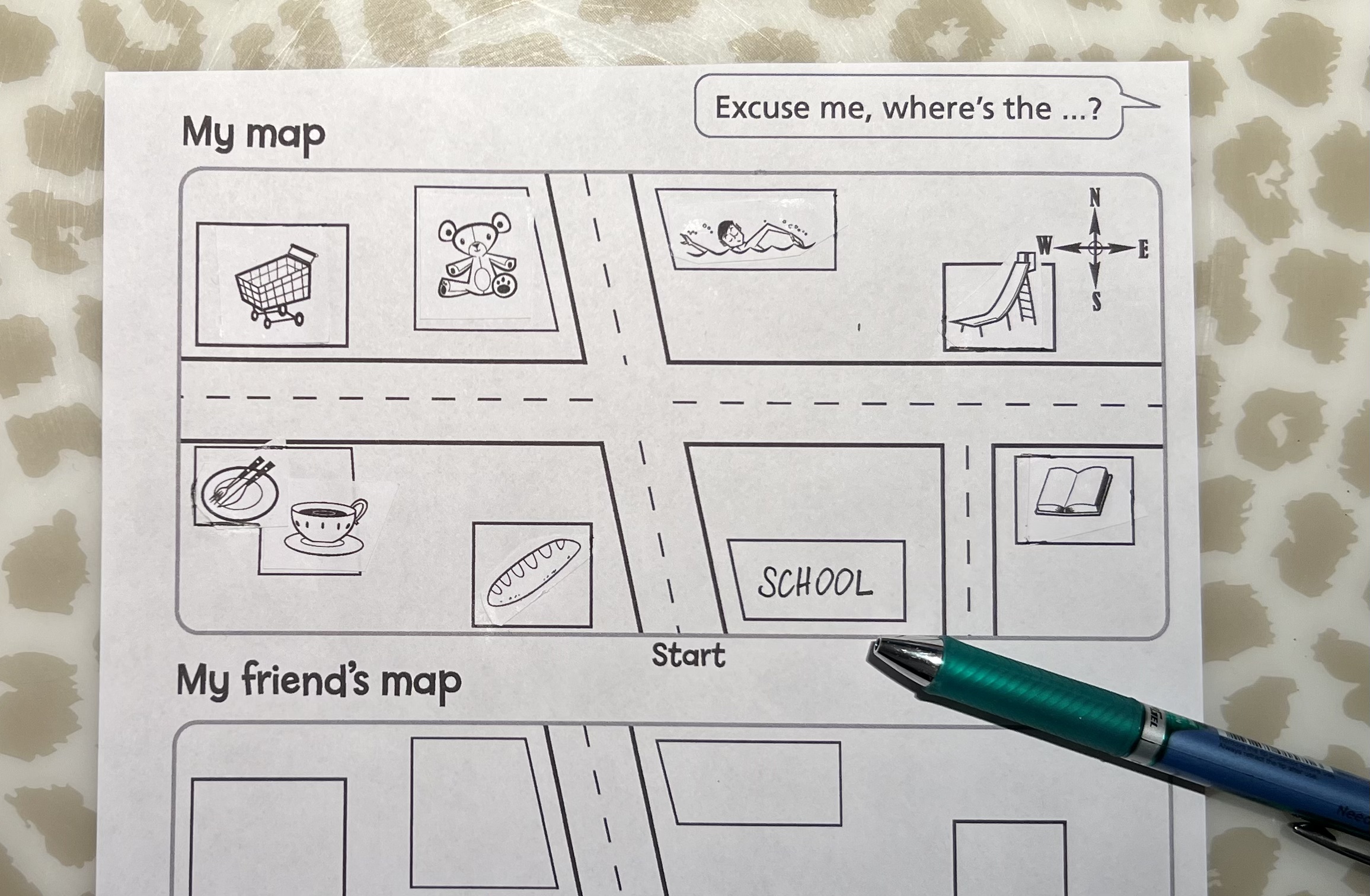 Na lekcji z elementami geografii uczyliśmy się jak pytać o drogę (Excuse me, where is (a toy shop?) i odpowiadać na takie pytanie: