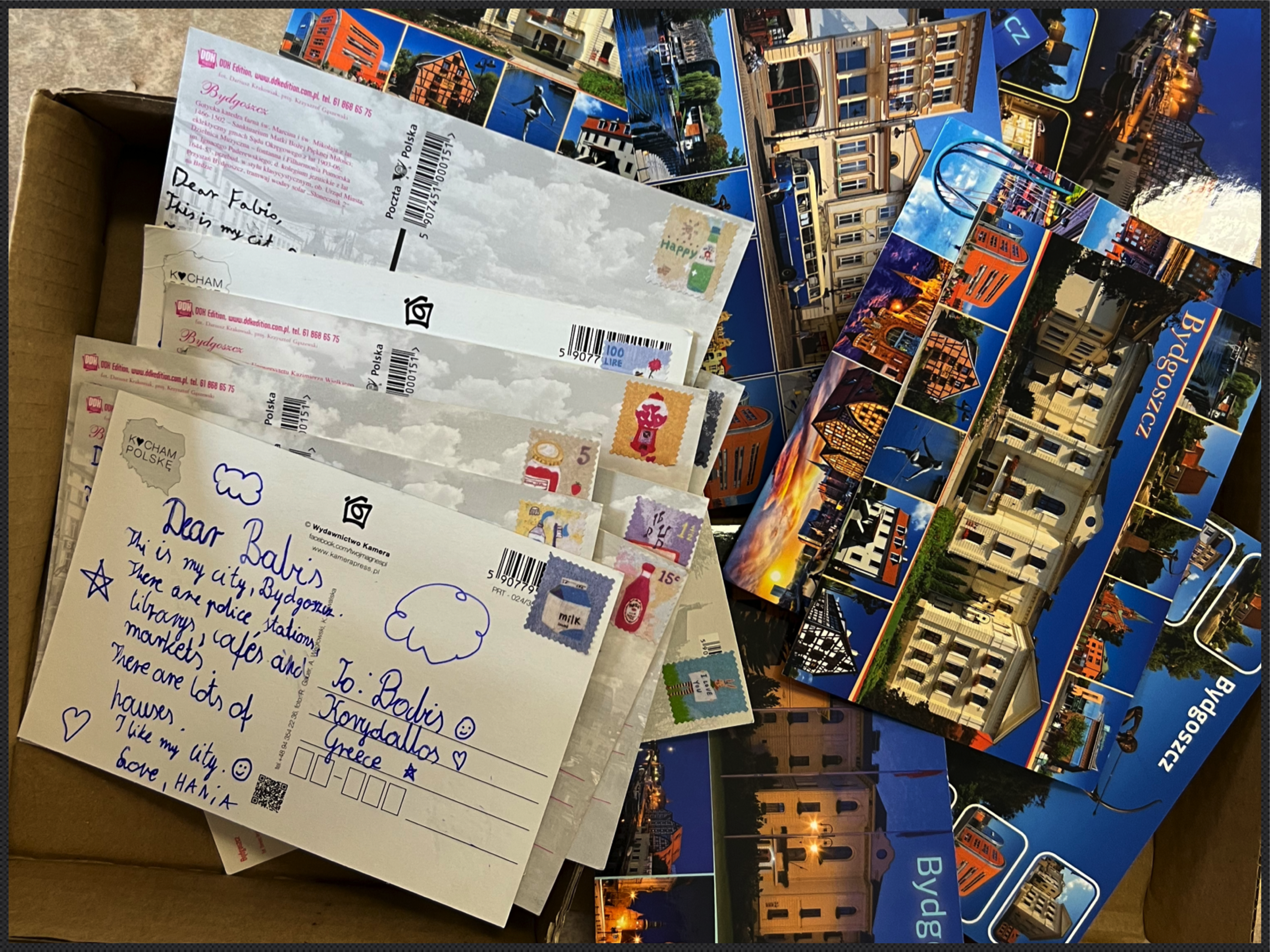 Po teście napiszemy i wyślemy pocztówkę z Bydgoszczy i wyślemy do naszych przyjaciół. Póki co możecie zobaczyć jak trzy lata temu cieszyliśmy się pocztówek przysłanych przez dzieci z Olszówki. Są wykonane samodzielnie, bo to mała wioska.