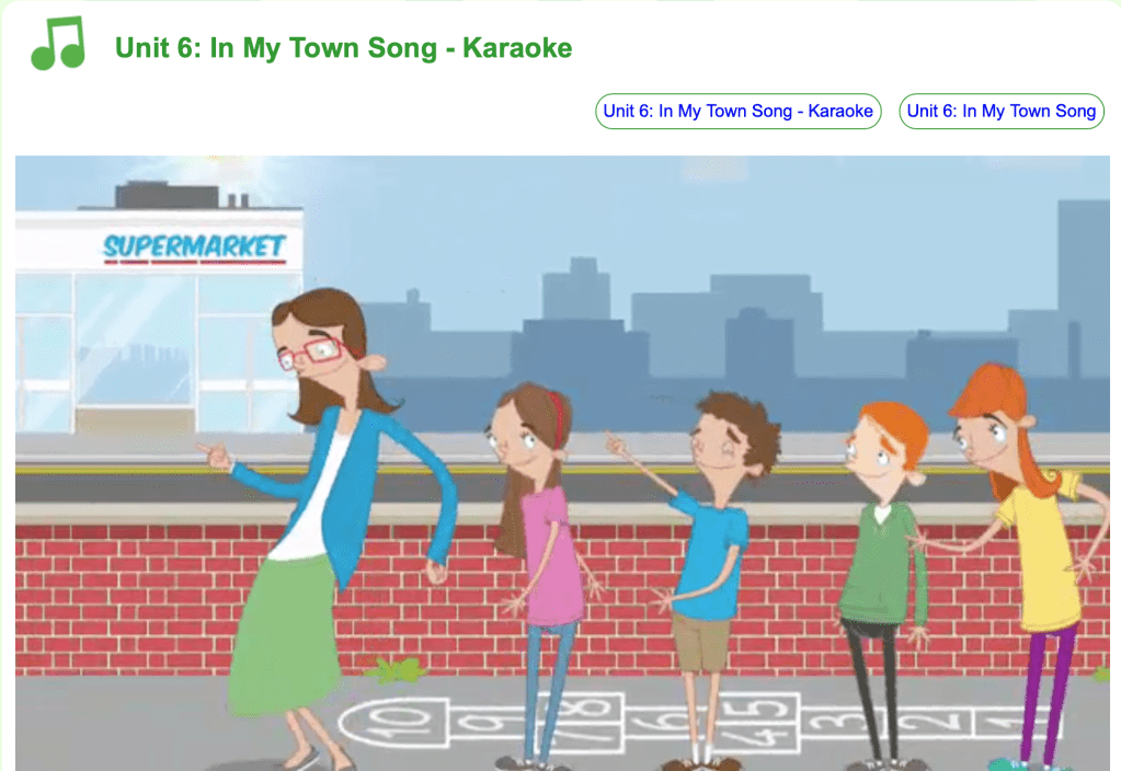 Jeśli polubiłeś/aś rytmiczankę My town Chant to możesz ją jeszcze raz zaśpiewać – są w niej wszystkie podstawowe słówka z rozdziału 6 oraz pytanie Where am I? i odpowiedź I am in (the supermarket).