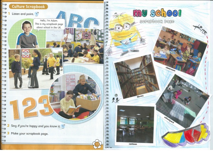 Dziś po sprawdzianie, dla odprężenia, udaliśmy się w podróż do UK czyli obejrzeliśmy film na DVD i zobaczyliśmy jak wygląda szkoła, klasa i pierwszy dzień w szkole uczennicy o imieniu Lizzie. Porównywaliśmy szkołę Lizzie i naszą. Potem zobaczyliśmy jak Adam, inny angielski uczeń, zrobił stronę ze skrawków (scrapbook page) o swoich ulubionych miejscach w jego szkole. Adam lubi swoją klasę (classroom), boisko/plac zabaw (playground) i kącik z książkami (book corner).