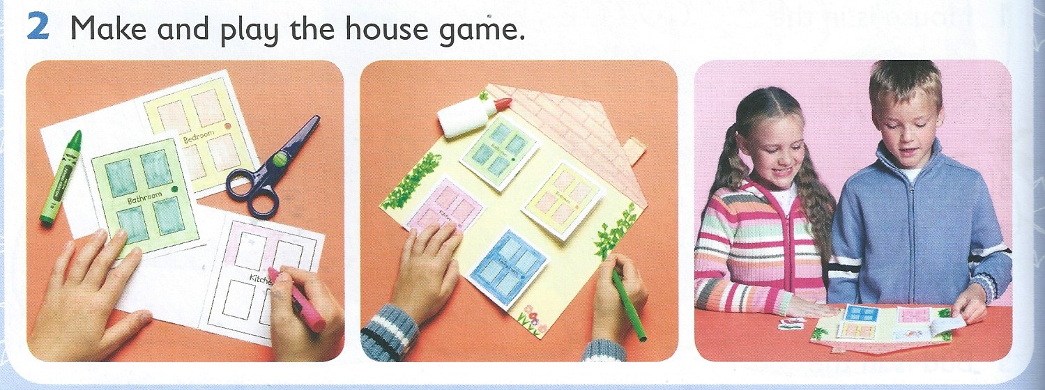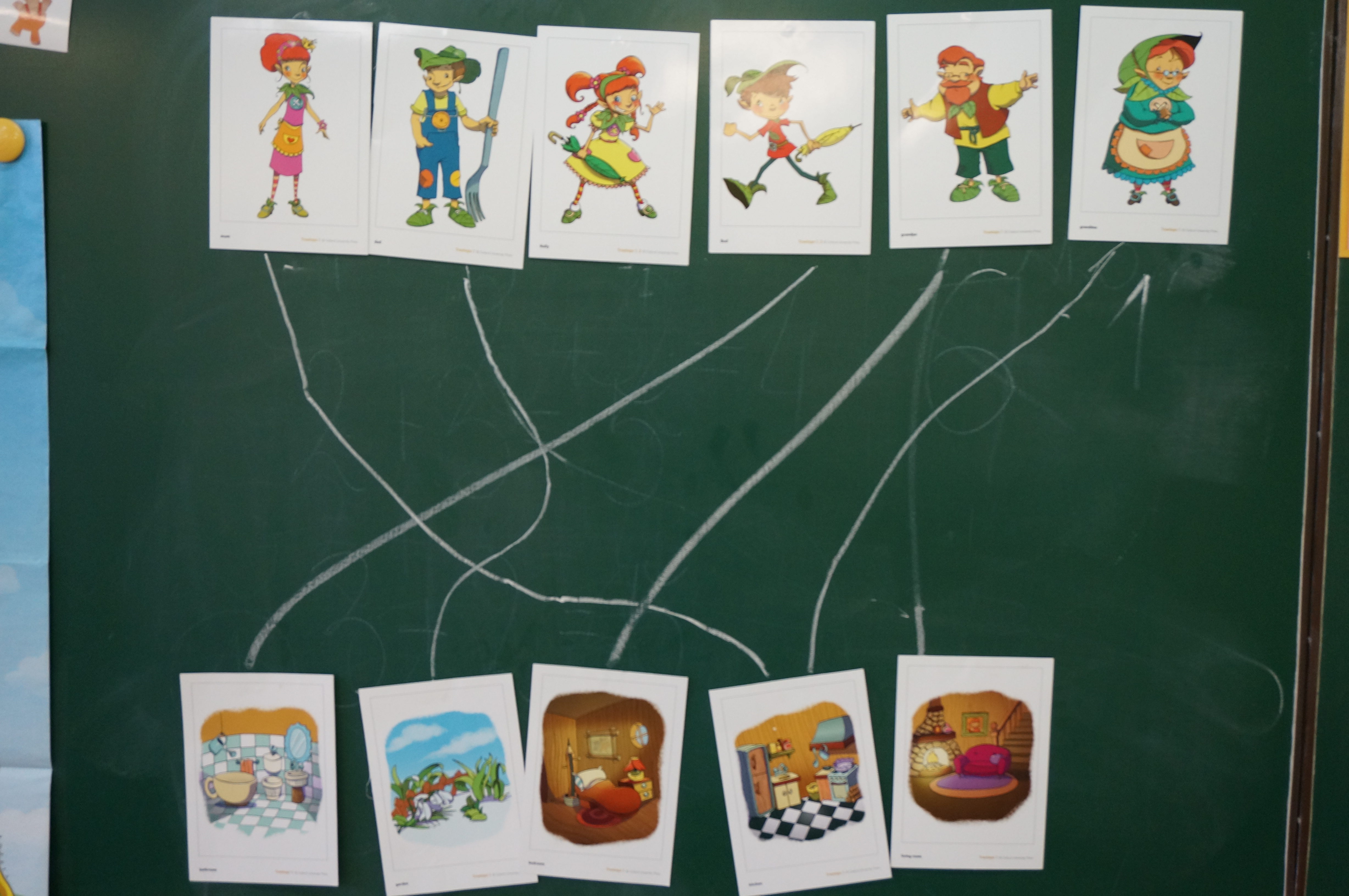 Ponieważ kończymy już rozdział 3 dzisiaj powtarzaliśmy i utrwalaliśmy cały materiał: pomieszczenia w domu i nazwy członków rodziny. Rozgrzewka z kartami obrazkowymi. Na rozpoznawanie: karty z rodziną w jednym rzędzie, mówię One – dad, jedno z dzieci podchodzi pisze przy obrazku z tatą jedynkę; na rozumienie: w jednym rzędzie obrazki z rodziną, w drugim pomieszczenia. Ja mówię: Grandma is in the garden, a jedno z dzieci podchodzi do tablicy i łączy grandma-garden linią.